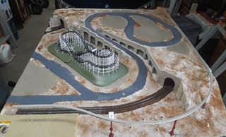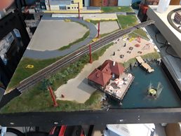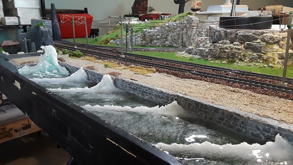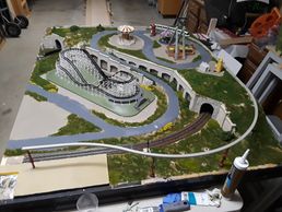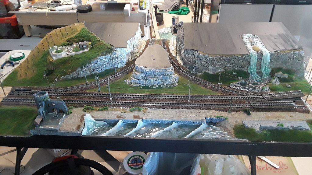 Module 2 - several layers of "magic water", static grass and ground covers. Note the supports for the Monorail.